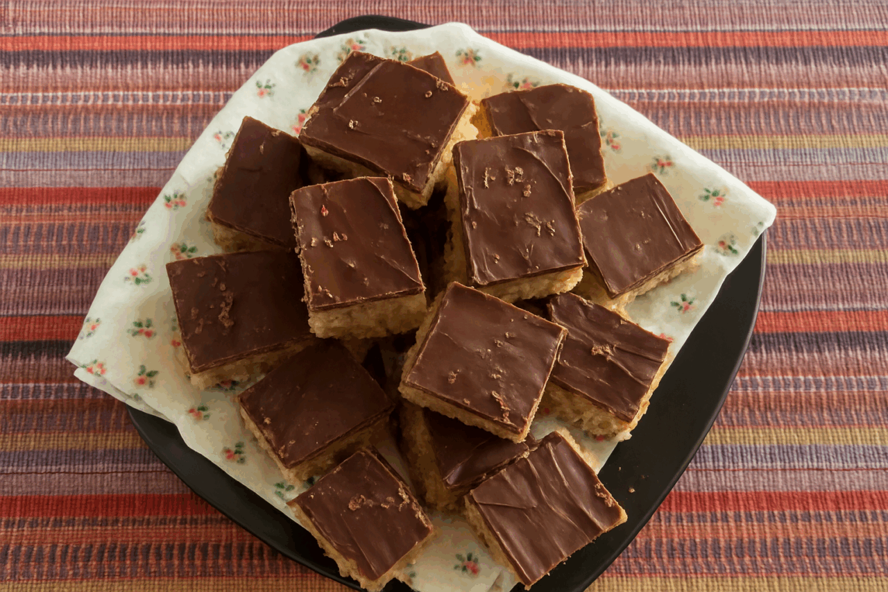 This recipe comes from the Schooner Lewis R. French where these bars are sometimes served as a lunch dessert. I find these bars easier to make then the standard ones where you have to melt marshmallows. They’re also way more delicious. The chocolate butterscotch topping is scrumptious.