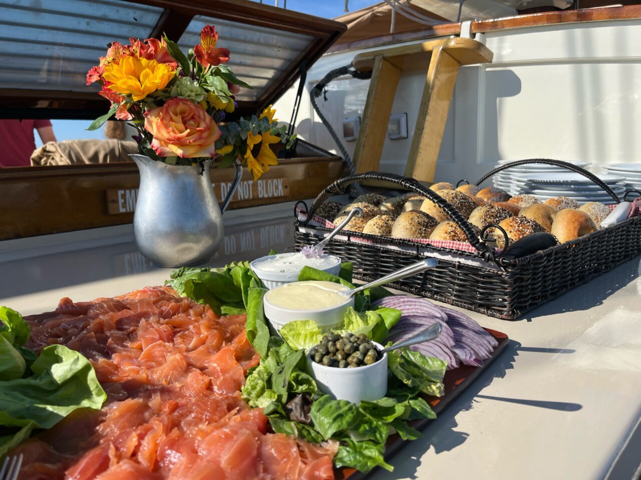 Aboard Schooner J. & E. RIGGIN, Chef Jocelyn cures fresh, sushi grade salmon herself and often serves it, thin sliced, with her much celebrated homemade bagels and fixings for breakfast on board. It would also make a beautiful addition to a charcuterie board.
