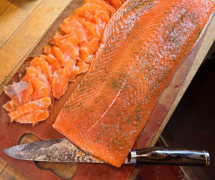 Aboard Schooner J. & E. RIGGIN, Chef Jocelyn cures fresh, sushi grade salmon herself and often serves it, thin sliced, with her much celebrated homemade bagels and fixings for breakfast on board. It would also make a beautiful addition to a charcuterie board.