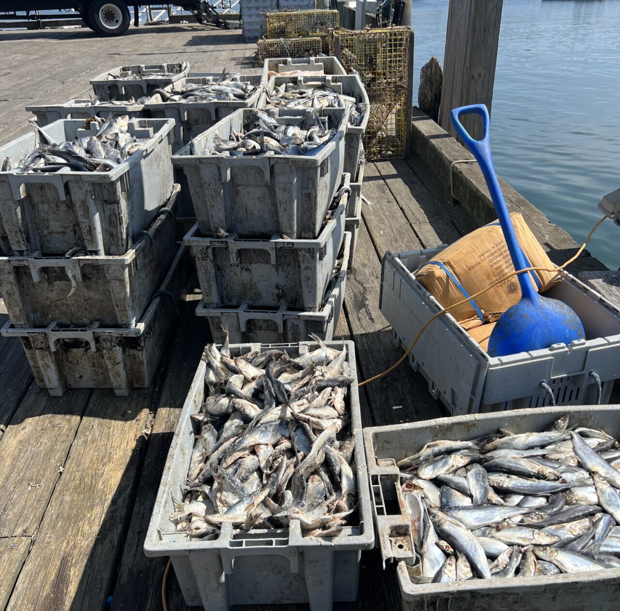 Crates of pogies ready to be used as bait on a wharf in Bass Harbor.