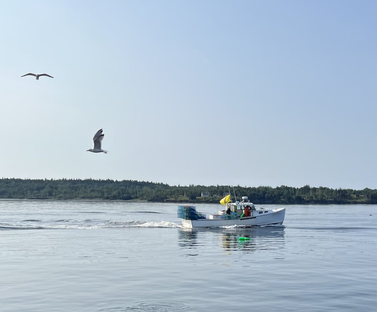 Charles Durfor Lobster steaming under a pile of rockweed as Windjammer Angelique rests at anchor.