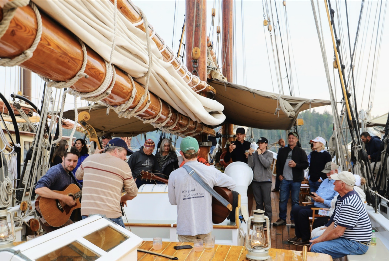 As evening sets in, the music starts. Professional musicians from across the fleet take center stage—bands like Reese Fulmer and the Carriage House Band or the Acadian Aces fill the harbor with sea shanties, folk songs, and traditional tunes that echo across the water. Guests mingle between boats, sharing stories and making new friends, while the setting sun paints the masts in golden light. It’s a celebration that brings together crews, captains, and passengers in a way that only happens once a year, when the entire windjammer community gathers as one.