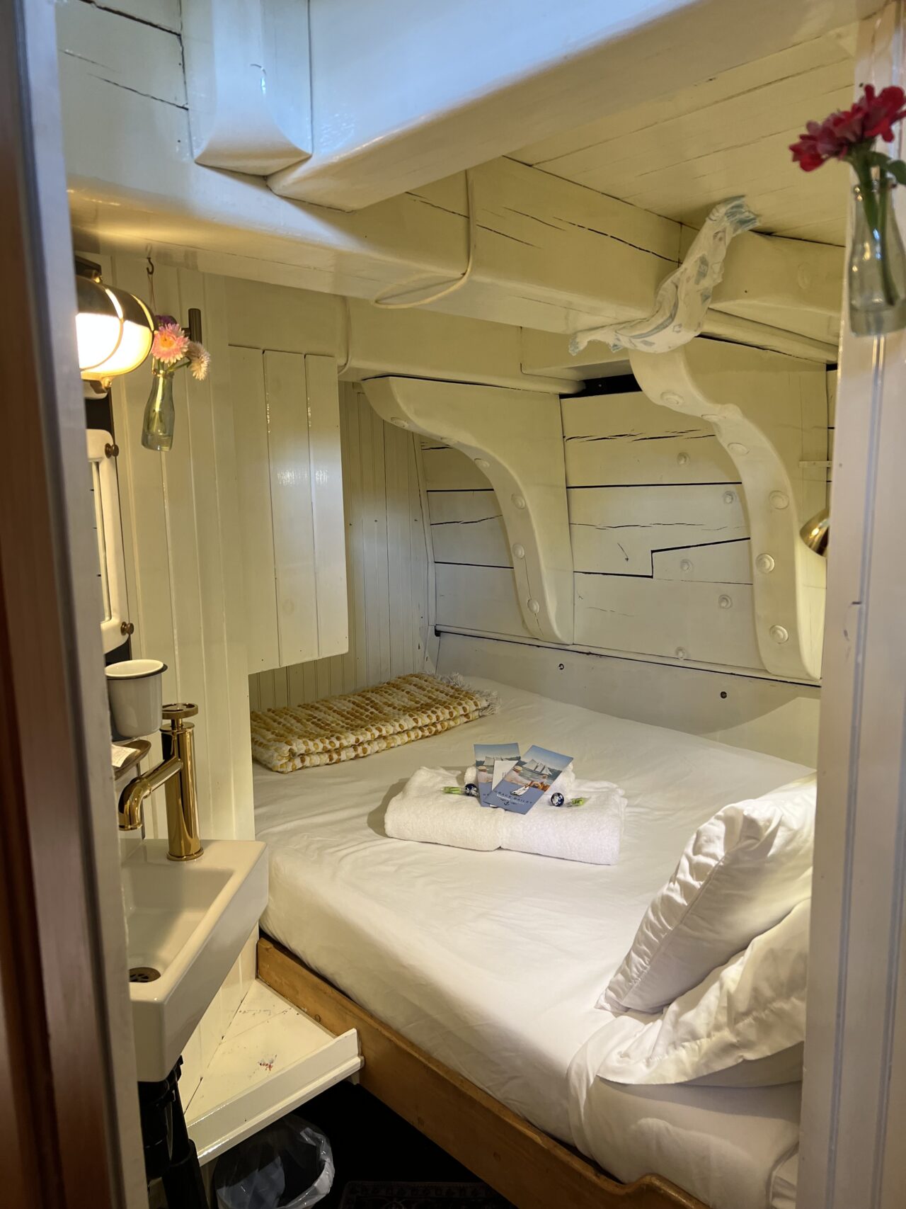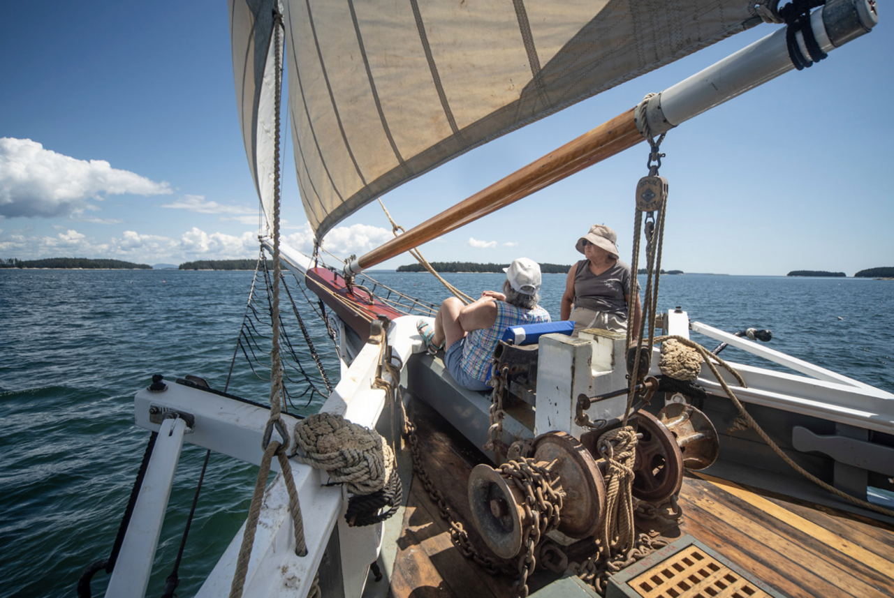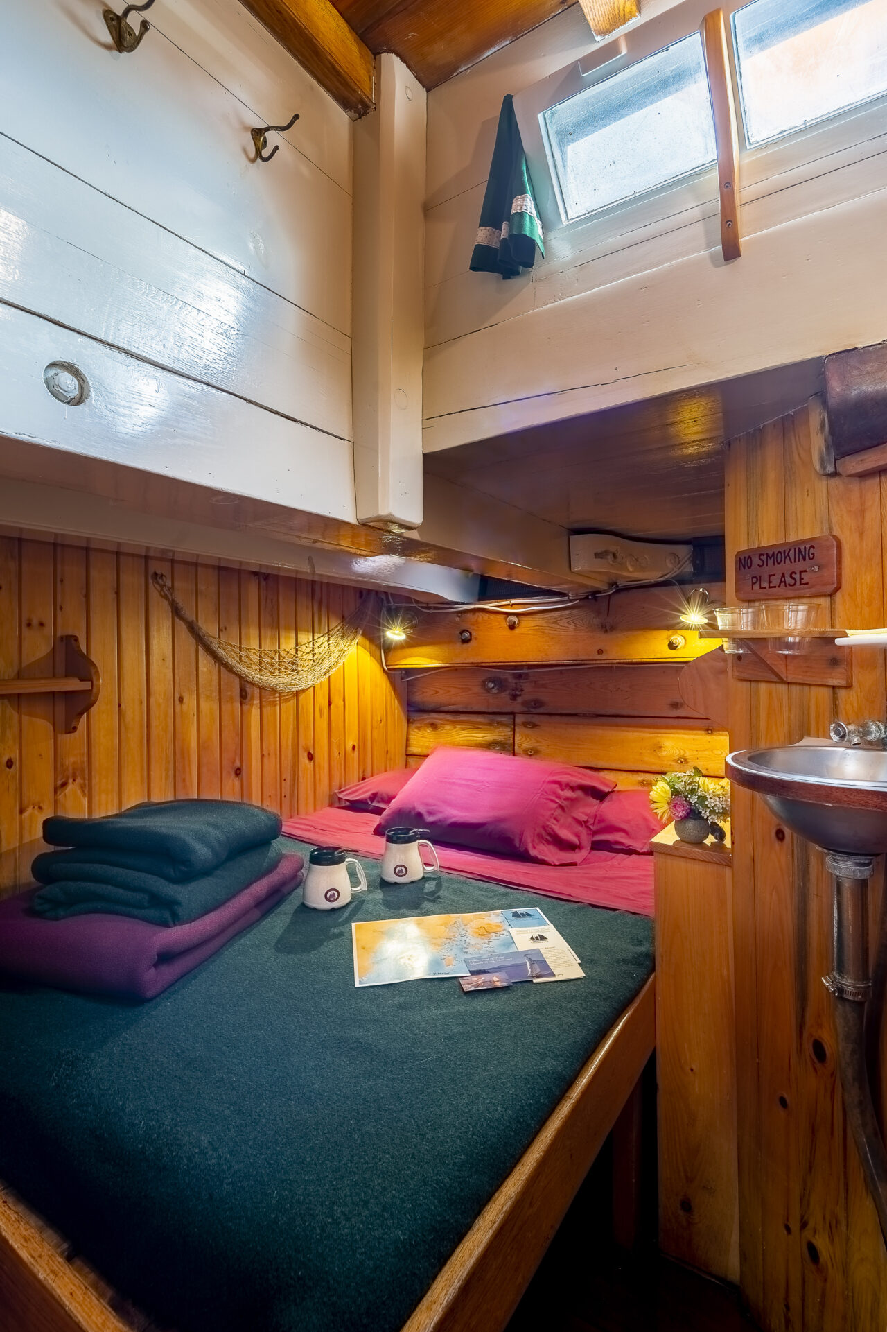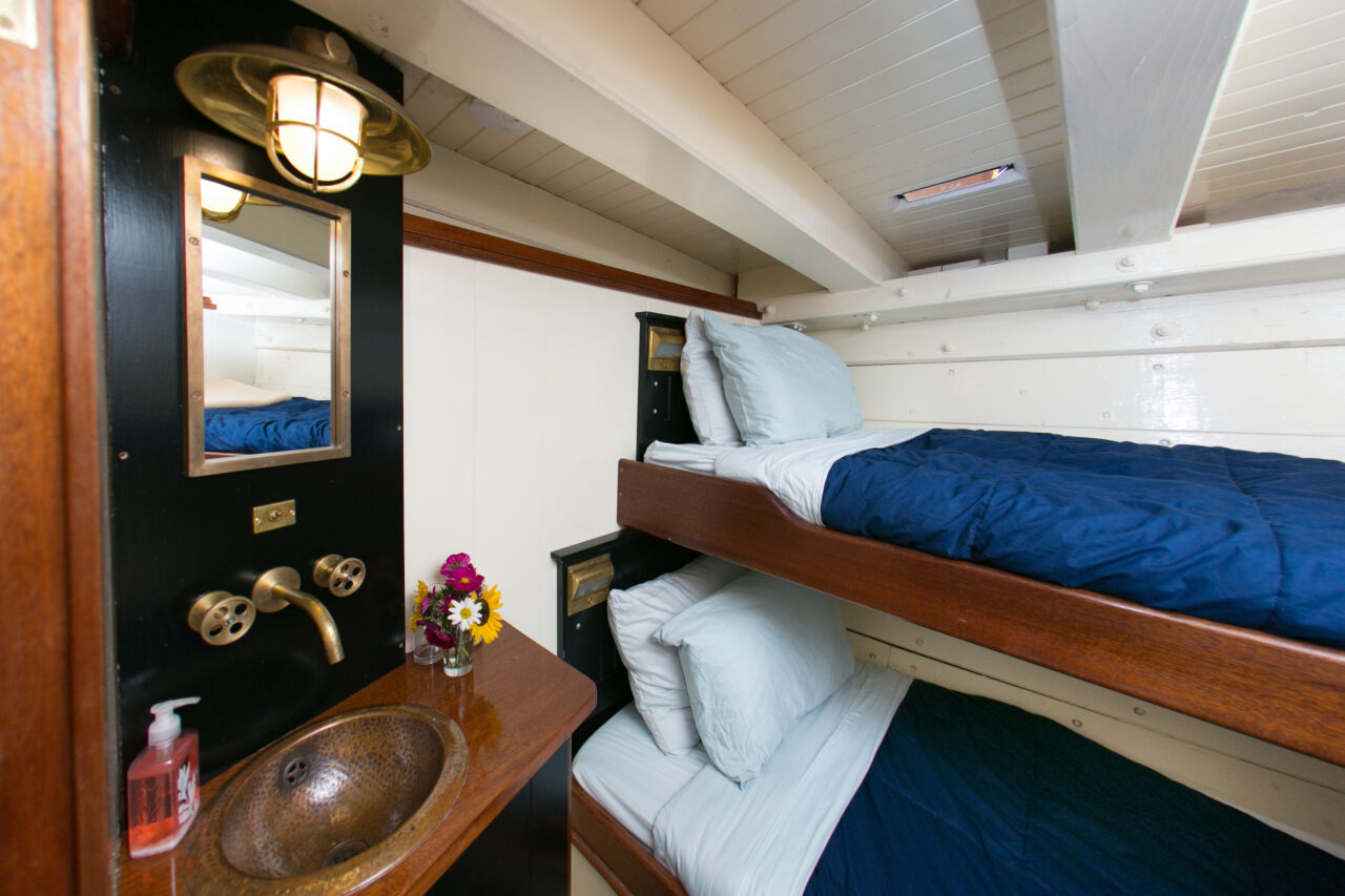 Every Maine windjammer offers private cabins for guests—a mix of doubles and singles, and occasionally a triple cabin on some vessels. Some double cabins have a double-bed, others have bunkbeds. While the cabins are cozy (this is a historic sailing vessel, after all), they are thoughtfully outfitted for comfort. Each cabin includes a bed(s) with fresh linens, pillows, and blankets, a sink with running water, a mirror, electric lights, and plenty of shelves and hooks for hanging your gear.